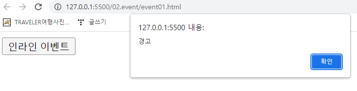 <button onclick="alert('경고')">인라인 이벤트</button>