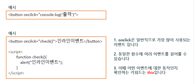 태그 자체에 이벤트 속성을 이용해서 js 코드를 직접 갖다가 넣어주는것이 인라인 이벤트모델이다.