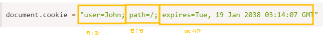 //// document.cookie = "키=값; expires = UTC스트링시간타입";