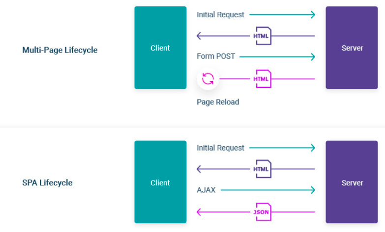 SPA는 html파일을 브라우저 측에서 로드하고, 필요한 데이터는 API와 ajax통신을 이용해서 처리합니다.