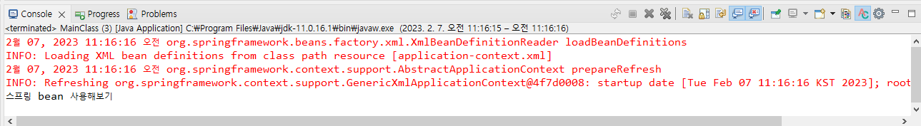 GenericXmlApplicationContext 클래스는 이렇게 작성된 스프링 설정 파일(application-context.xml) 을 읽어와 로딩이 시키고, 객체를 생성하며, 초기화하는 역할을 합니다. 또한 getBean 메소드를 이용하여 스프링 컨테이너에 생성된 객체에 접근 가능할 수 있게 됩니다.