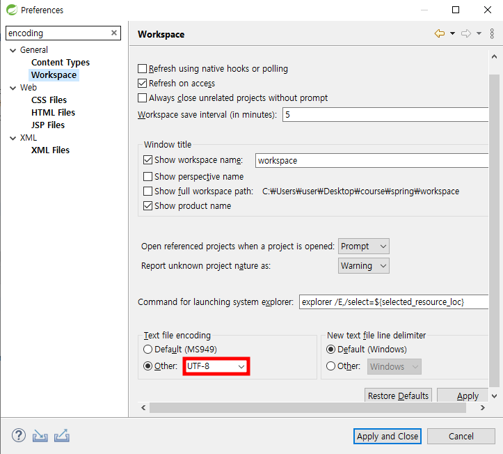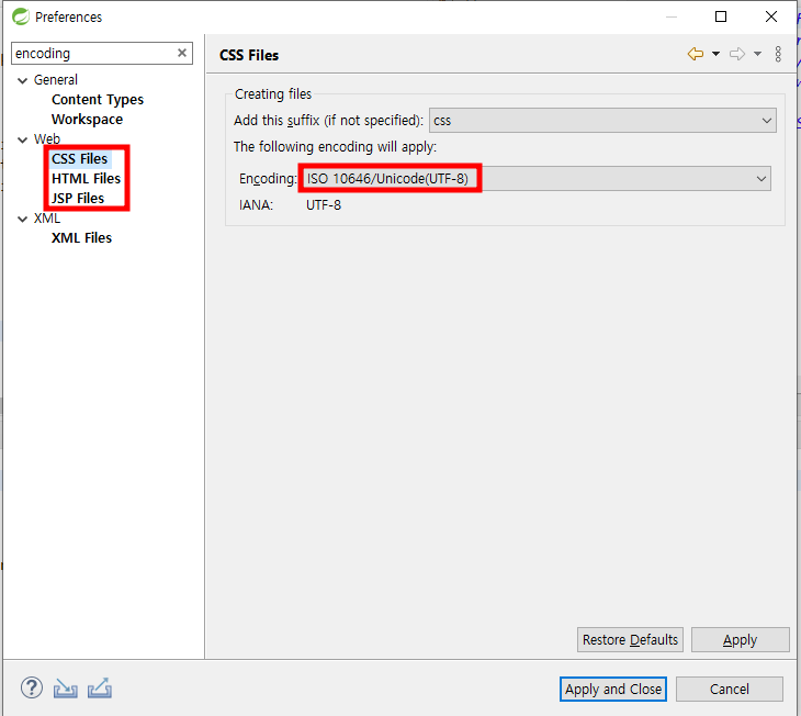 window - preference - encoding 검색 - workspace / css / html / jsp 모두 utf-8로 변경