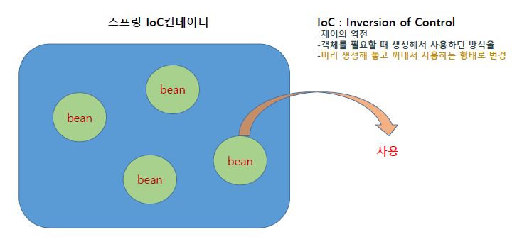 자바 객체의 라이프 사이클을 스프링 컨테이너가 직접 관리 하며,