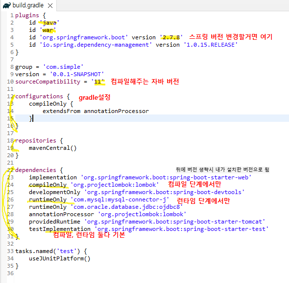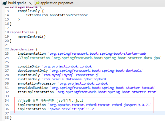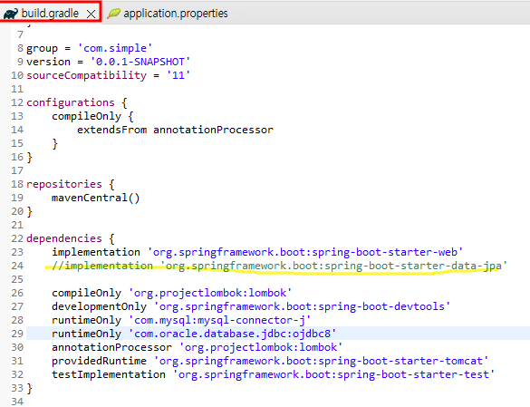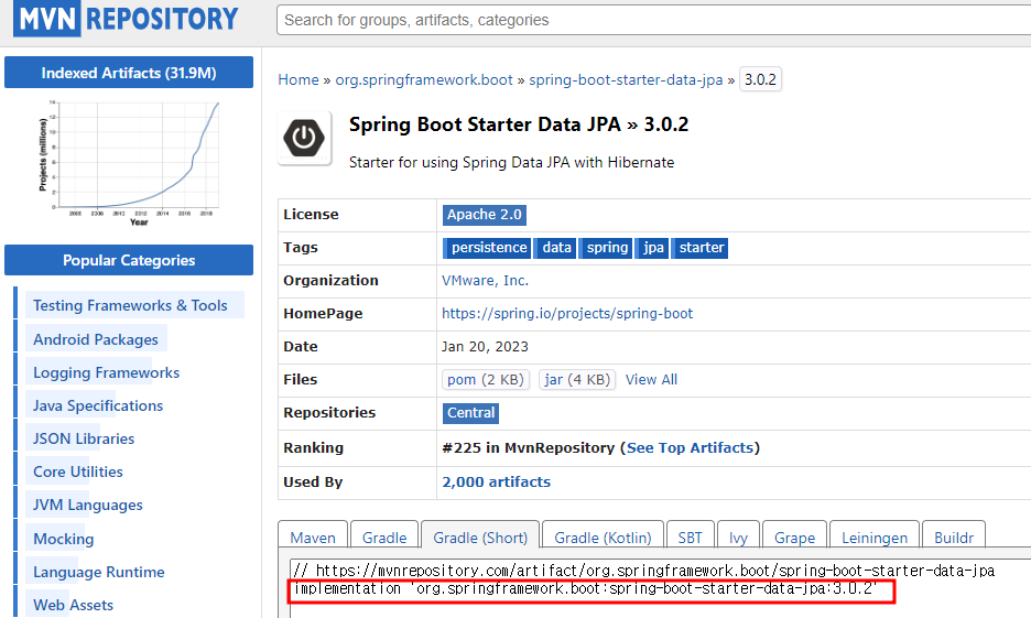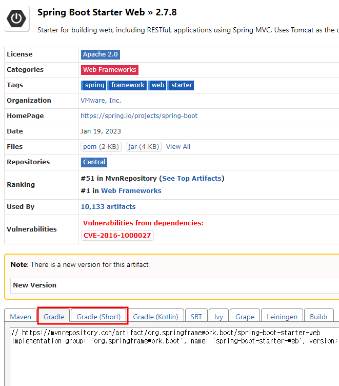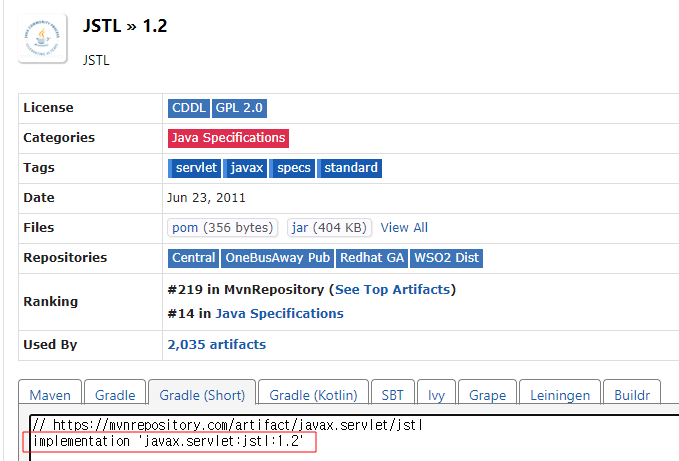 필요한 레파지토리가 있다면 maven repository에 가서 검색 후 gradle(Short) 눌러서 dependencies에 넣어서 사용