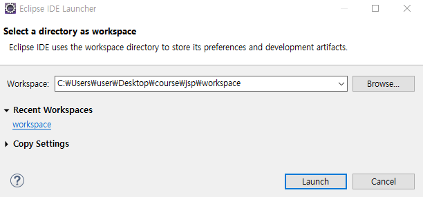 기존폴더 course > 📂 jsp (폴더 생성) > 📂 workspace (폴더 생성)