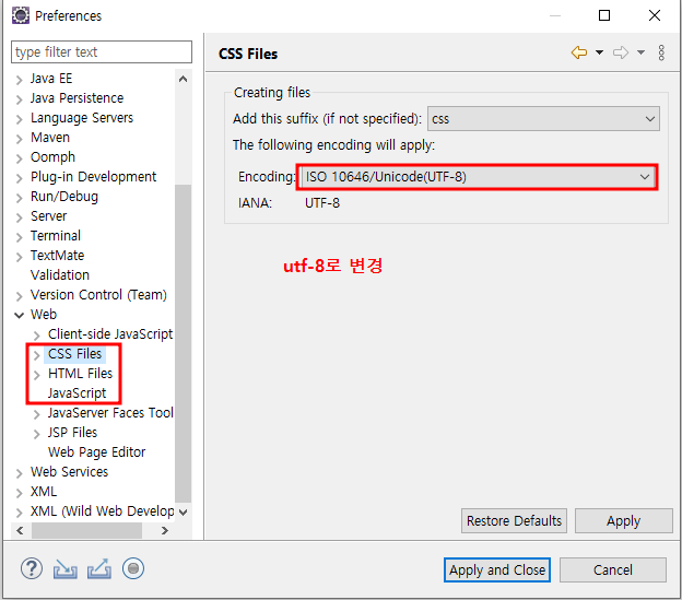 window > preferences > web > CSS Files / HTML Files/ JavaScript (3개 다 UTF-8로 변경)